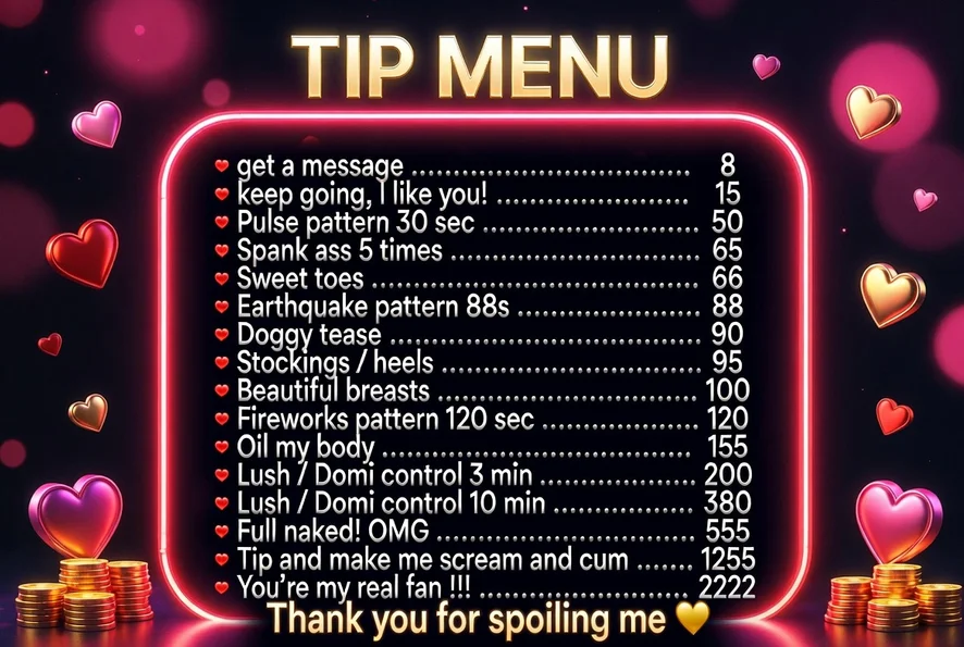 Tarian Erotis, Pertunjukan Minyak, Topless, Mainan Puting, Handjob, Heels, Nilon, Ahegao, Meraba, Masturbasi, Twerk, Memukul, Tingkat Penis, Fetish Kaki, Blowjob, Anal, Tenggorokan, Cowgirl, Striptis, Mainan Anal, Dildo atau Vibrator, Orgasme, Squirt, Penghinaan, Dirty Talk, Instruksi Masturbasi, Mainan Seks